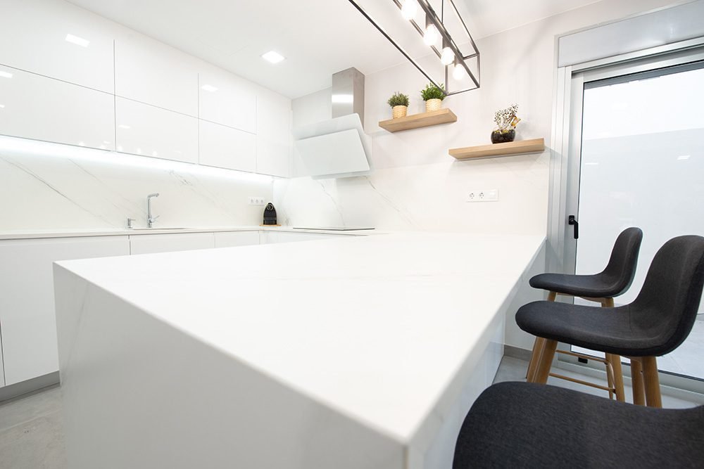 Pureza en los Acabados: Se han instalado armarios con frontales en blanco lacado, logrando una superficie continua y elegante que refleja la luz natural y amplifica visualmente cada metro cuadrado.