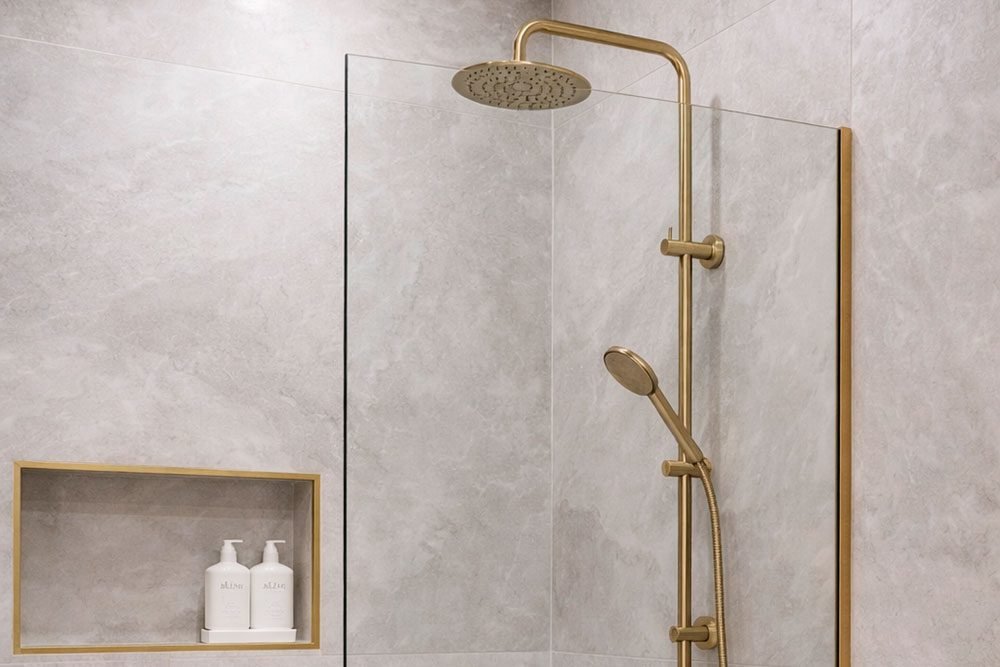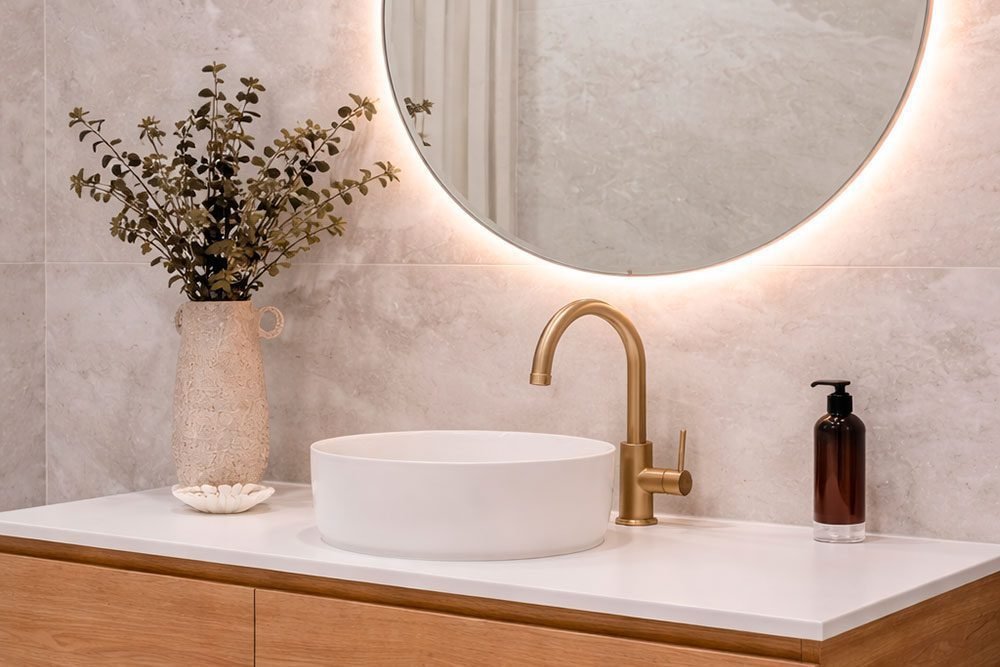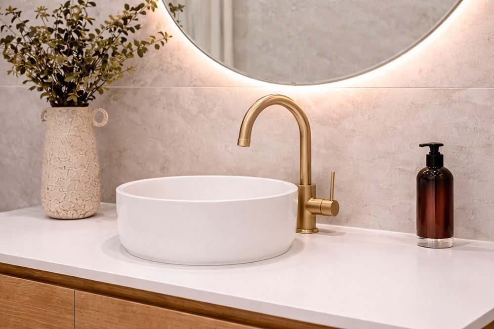 Detalles de Lujo Moderno: El punto focal de la estancia es la grifería en tonos dorados. Su diseño de líneas modernas aporta un toque de tendencia y exclusividad, rompiendo con la sobriedad del neutro para inyectar una dosis de calidez y elegancia.